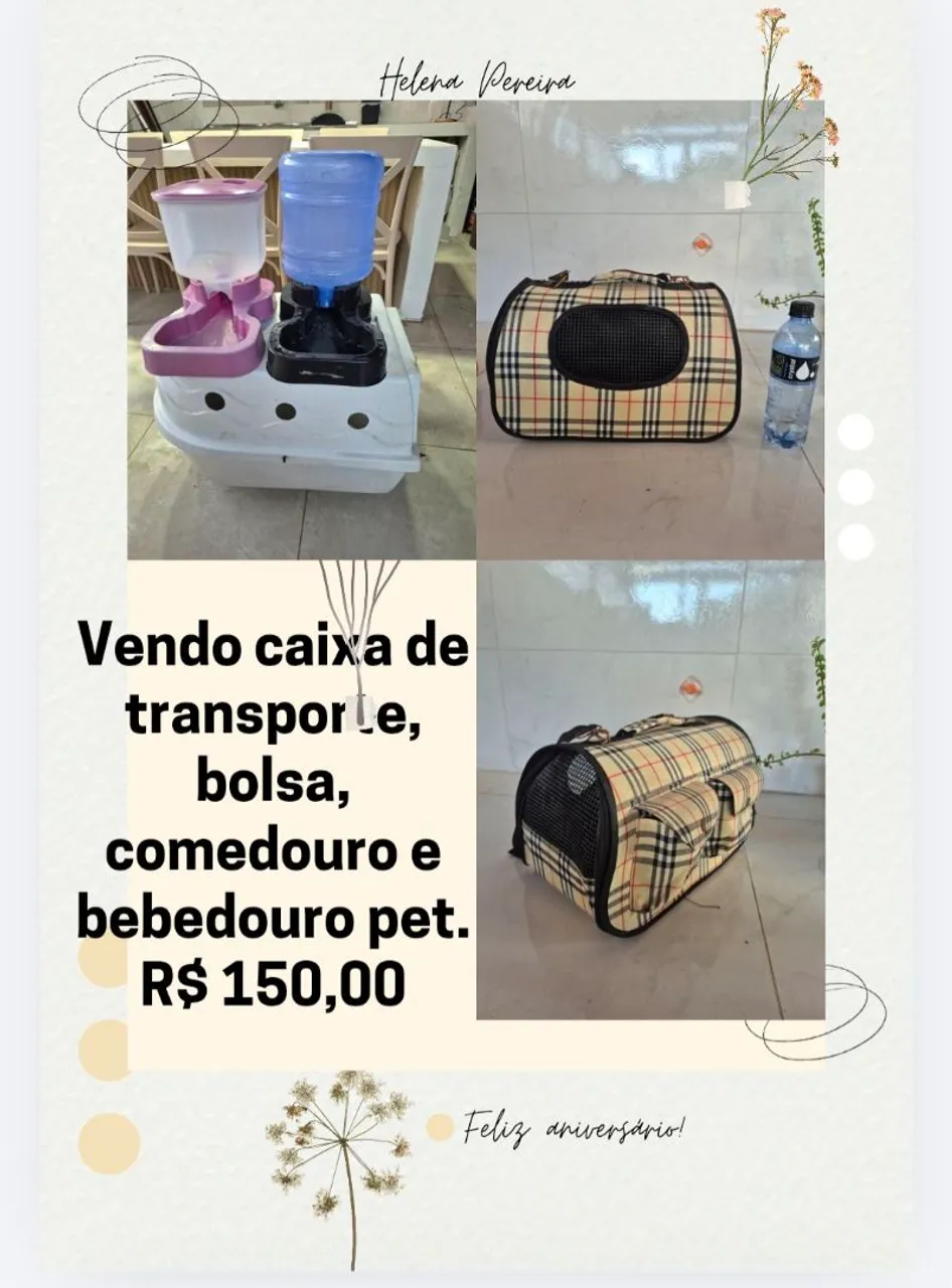 Conjunto completo para o seu pet! Inclui caixa de transporte grande, bolsa para até 8 quilos, comedouro e bebedouro. Tudo o que você precisa para o conforto e bem-estar do seu amigo.