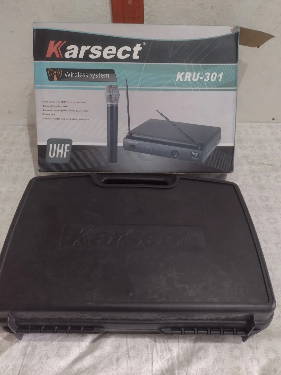 Microfone sem fio Karsect KRU-301, ideal para DJs. Sistema UHF de alta sensibilidade, receptor de canal único e controle de ganho de áudio. Perfeito para suas apresentações!
