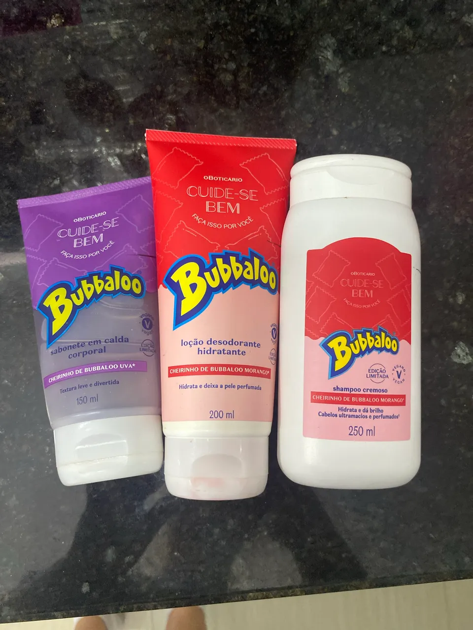 Combo Bubbaloo para um cuidado completo! Sabonete em calda, loção hidratante e shampoo cremoso com cheirinho delicioso de Morango. Deixe sua pele e cabelo macios e perfumados!