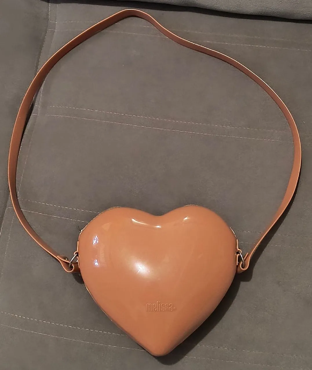 Linda bolsa em formato de coração da Melissa, cor caramelo, perfeita para dar um toque de estilo ao seu look. Design moderno e charmoso.