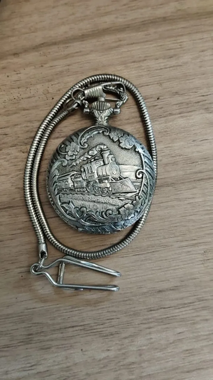 Relógio de bolso vintage com design de trem, uma peça única que combina elegância e história. Perfeito para colecionadores e amantes de acessórios clássicos.