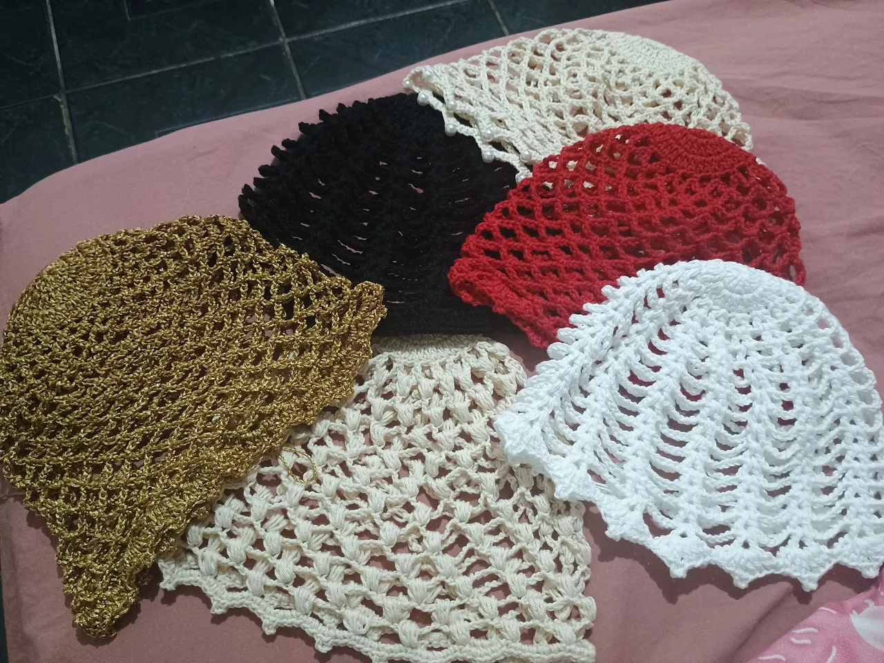 Diferentes modelos e tamanhos de toucas para cabeça.