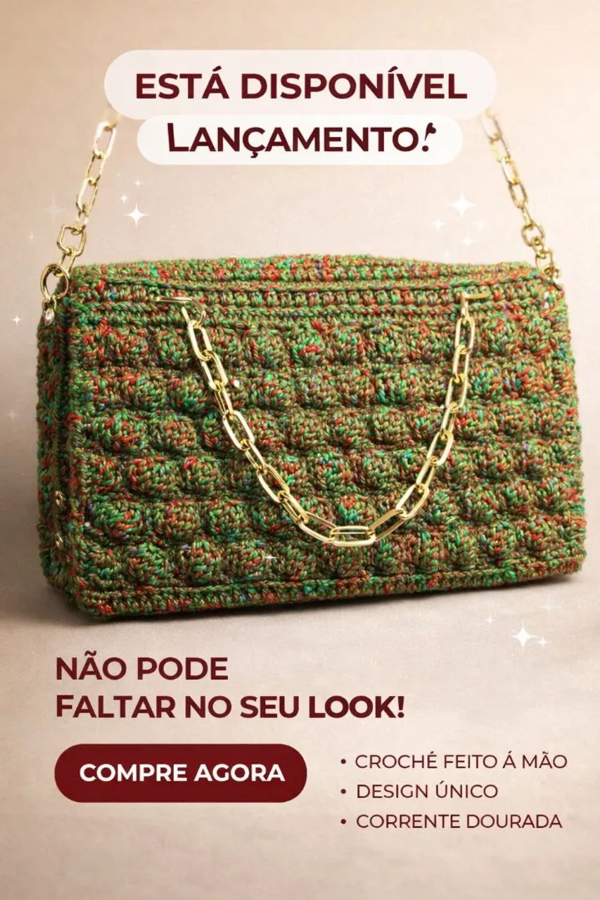 Linda bolsa de crochê, feita à mão com design único e corrente dourada. Perfeita para dar um toque especial ao seu look!
