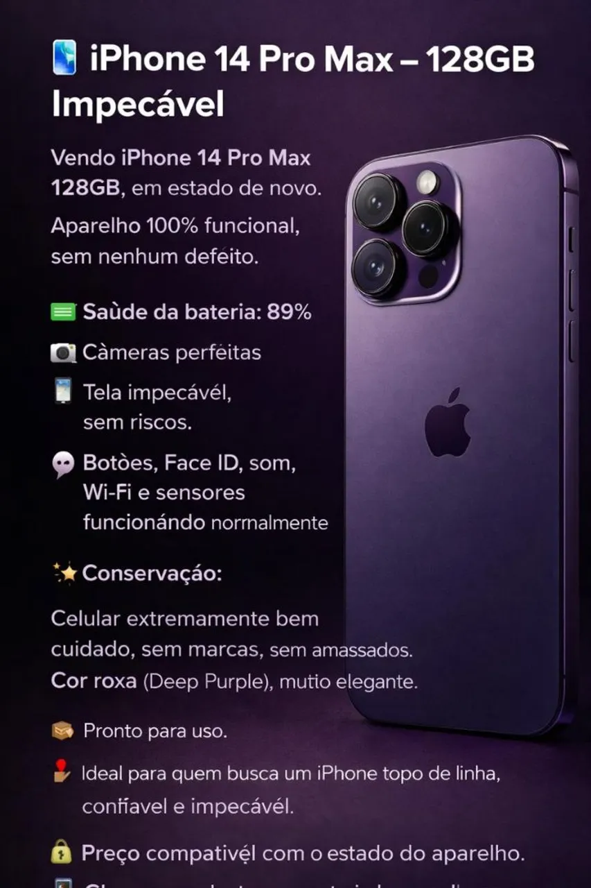 Experimente a excelência com o iPhone 14 Pro Max de 128GB! Aparelho impecável, 100% funcional e com bateria em excelente estado. Design elegante na cor roxa (Deep Purple), pronto para uso. Perfeito para quem busca um iPhone top de linha, confiável e com desempenho imbatível.