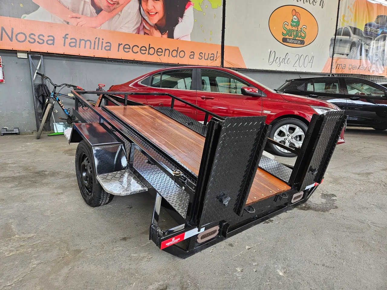 Reboque para transporte de quadriciclo, com design moderno e resistente. Ideal para transportar quadriciclos com segurança e praticidade. Possui lanternas de led, estepe, corrente de segurança, fechamento de madeira no centro e rampas de acesso para o quadriciclo.