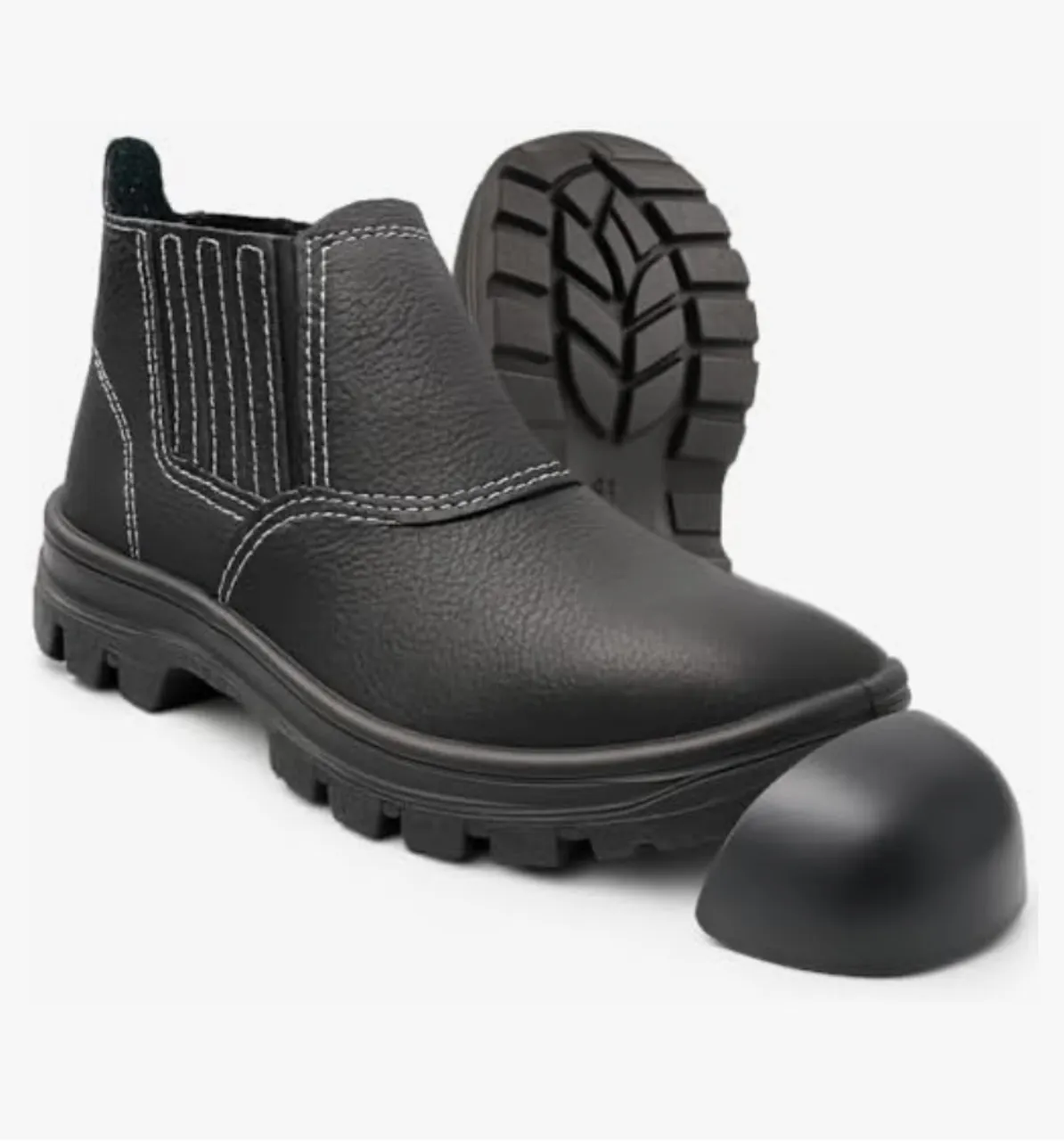 Bota preta de segurança, ideal para proteção e conforto no trabalho. Design moderno e resistente.