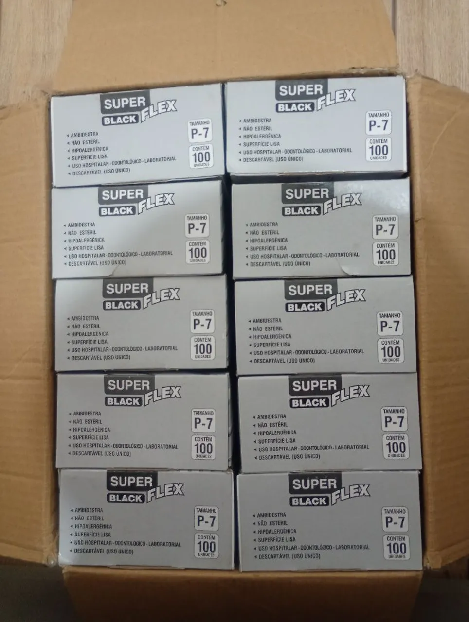 Caixa com mil luvas de vinil Super Black Flex tamanho P-7, ideal para uso laboratorial e culinário. São ambidestras, não estéreis, hipoalergênicas, com superfície lisa e descartáveis.