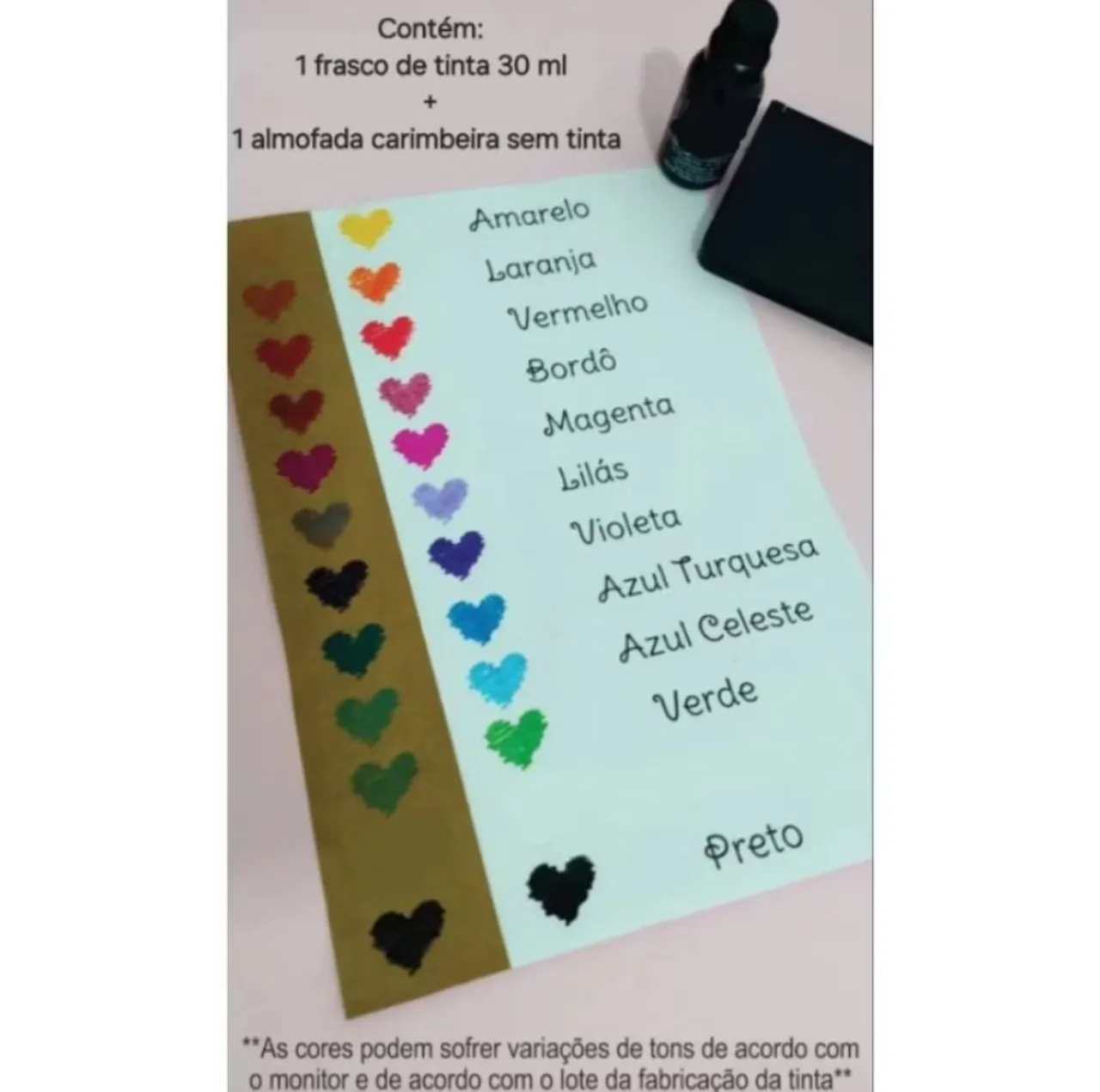 Escolha a cor da tinta no chat, as cores que estão disponíveis são as das fotos do anúncio, mas solicite no chat que te envio mais detalhado. Tenho anúncio da tinta unitária para caso queira comprar 2 cores de tintas para carregar a almofada com 2 (até com 3 cores é possivel) e fazer uma carimbada em degradê (fica lindo)!
