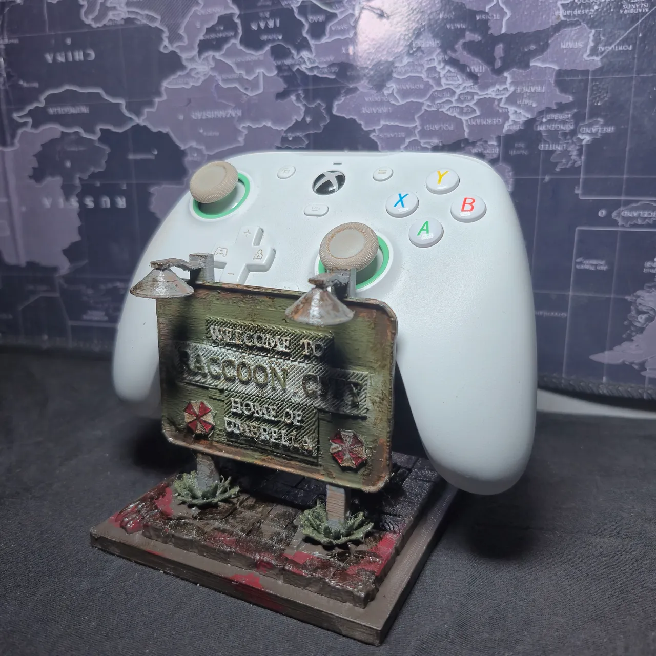 Leve o clima sombrio e icônico de Raccoon City para o seu setup. Este suporte para controle é inspirado na antiga e lendária sede da Umbrella Corporation, trazendo um visual pós-apocalíptico cheio de detalhes que remetem diretamente ao universo dos games e do terror clássico. Produzido em impressão 3D, o suporte apresenta acabamento detalhado, com aparência envelhecida e elementos que simulam desgaste urbano, deixando a peça ainda mais imersiva e colecionável. Ideal para organizar e destacar seu controle de forma criativa, transformando-o em parte da