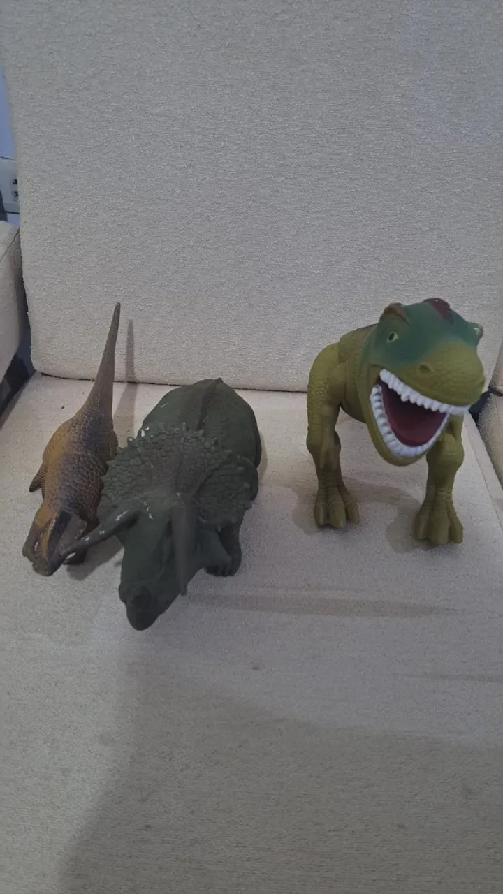 Conjunto de dinossauros de brinquedo. Perfeitos para colecionar ou para brincar, esses dinossauros são ideais para estimular a imaginação. Valor referente ao trio (3 unidades). Pode ser vendido separadamente.