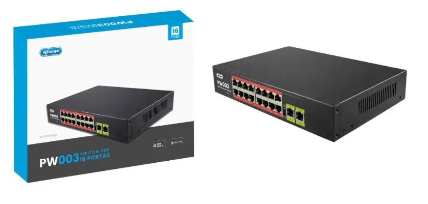 Explore o Switch PoE Knup KP-PW003, uma solução robusta e eficiente para suas necessidades de rede. Com 16 portas RJ45 que suportam negociação automática de 10/100Mbps e função auto MDI/MDIX, este switch oferece instalação plug and play para facilitar sua vida. Ideal para pequenos e médios negócios, o KP-PW003 é compatível com o padrão IEEE802.3/x/u e possui uma largura de banda backplane de 12Gbps, garantindo performance ágil e confiável para suas operações diárias. Alimentado por uma ampla faixa de tensão de 100 a 240V AC, este switch proporciona flexibilidade e segurança energética. Otimize sua rede com o Switch PoE Knup KP-PW003 e experimente um novo nível de eficiência.