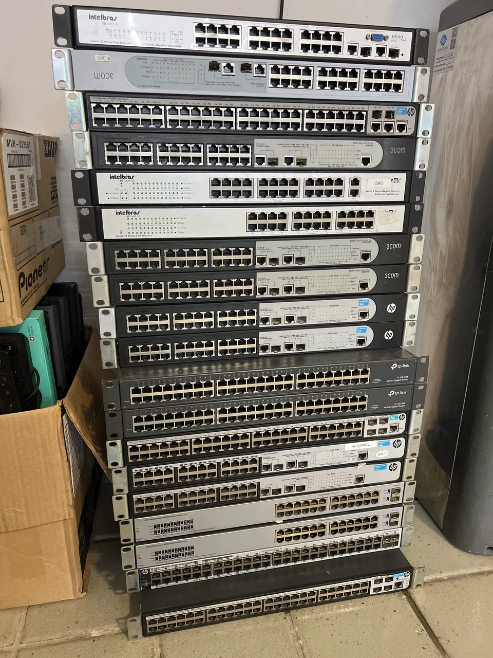 Ampla variedade de switches de rede para otimizar sua infraestrutura. Modelos Intelbras, 3com, HP e TP-Link com diferentes portas e capacidades para atender às suas necessidades de conectividade.