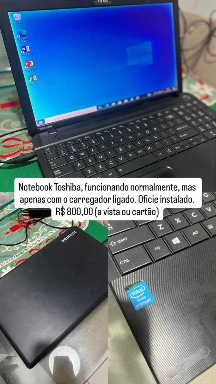 Notebook Toshiba com processador Intel Pentium, ideal para tarefas diárias. Leve e prático, perfeito para estudo e trabalho. Funcionando normalmente, porém só liga no carregador conectado.