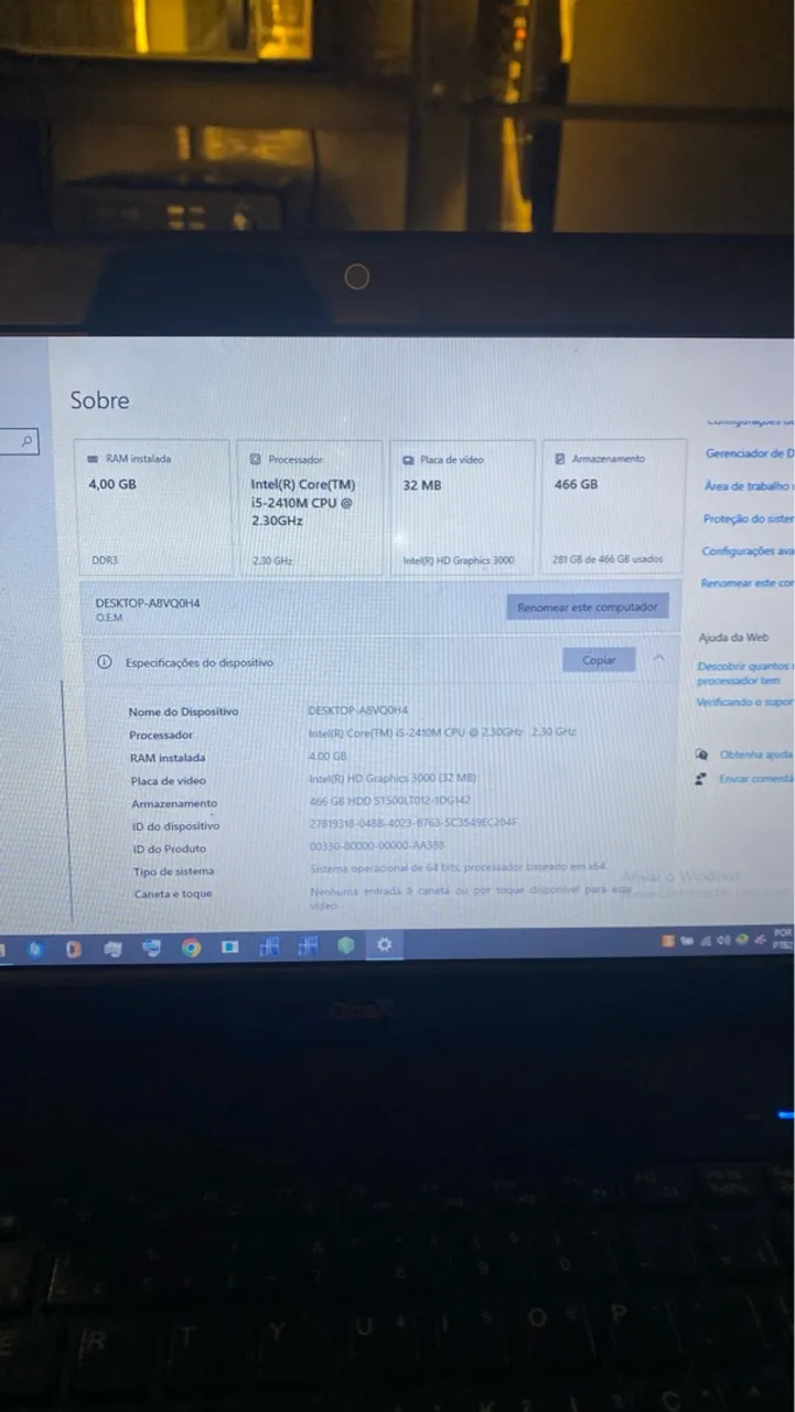 Notebook Acer com processador Intel Core i5, 4GB de RAM e 466GB de armazenamento. Ideal para tarefas do dia a dia! (Teclado com defeito, mas acompanha outro por fora sem fio)