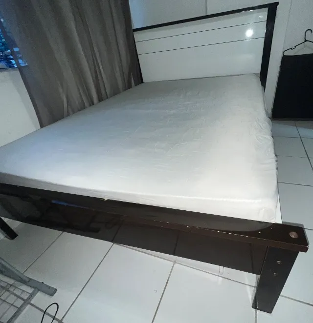 Cama de casal em madeira, com cabeceira, design moderno e elegante para seu quarto. Proporciona conforto e beleza, ideal para sono tranquilo.