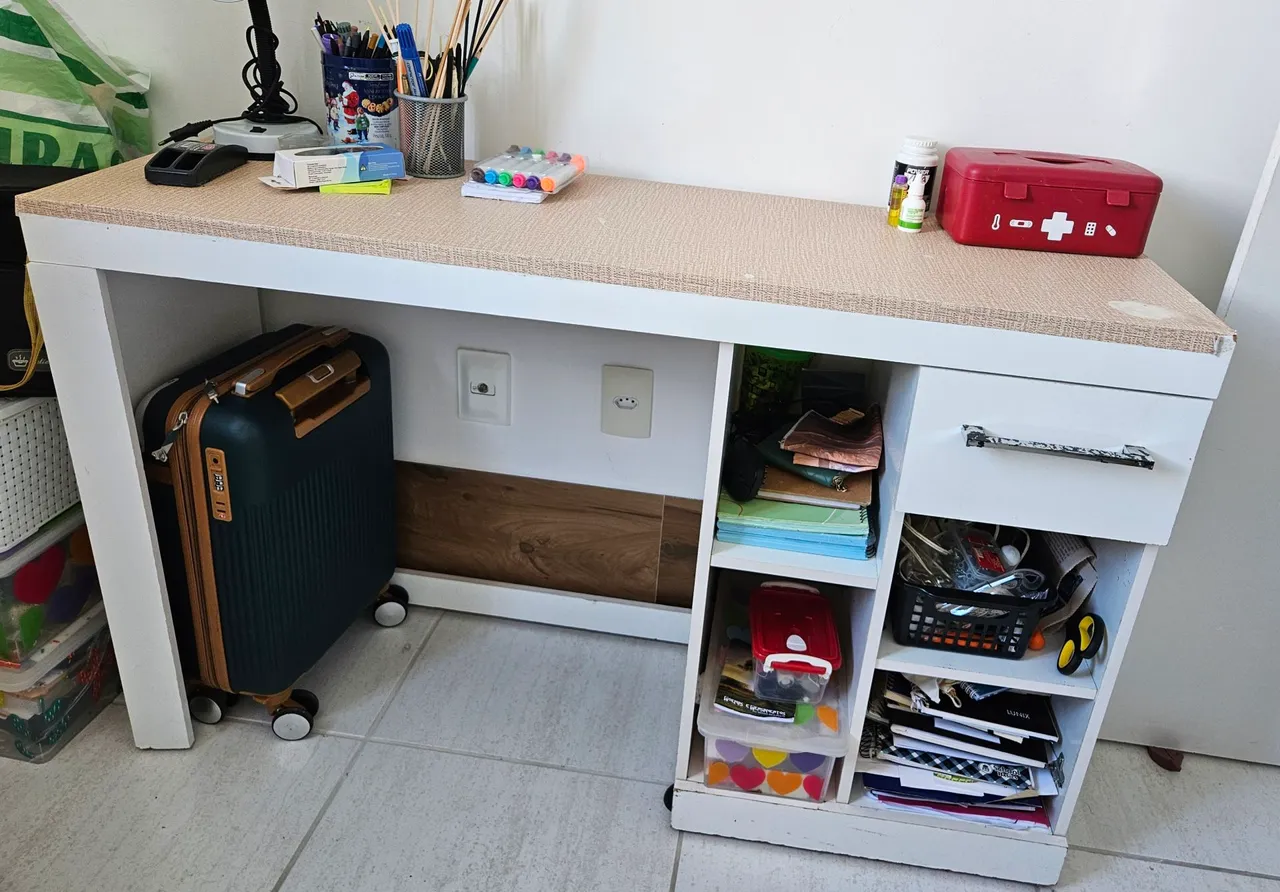 Linda escrivaninha branca, perfeita para organizar seu espaço de trabalho ou estudo. Pode ser utilizada com ou sem o adesivo. Pra quem quiser, posso disponibilizar o rolo de adesivo, pois temho sobrando. O endereço de retirada fica próximo a Univ. Católica.