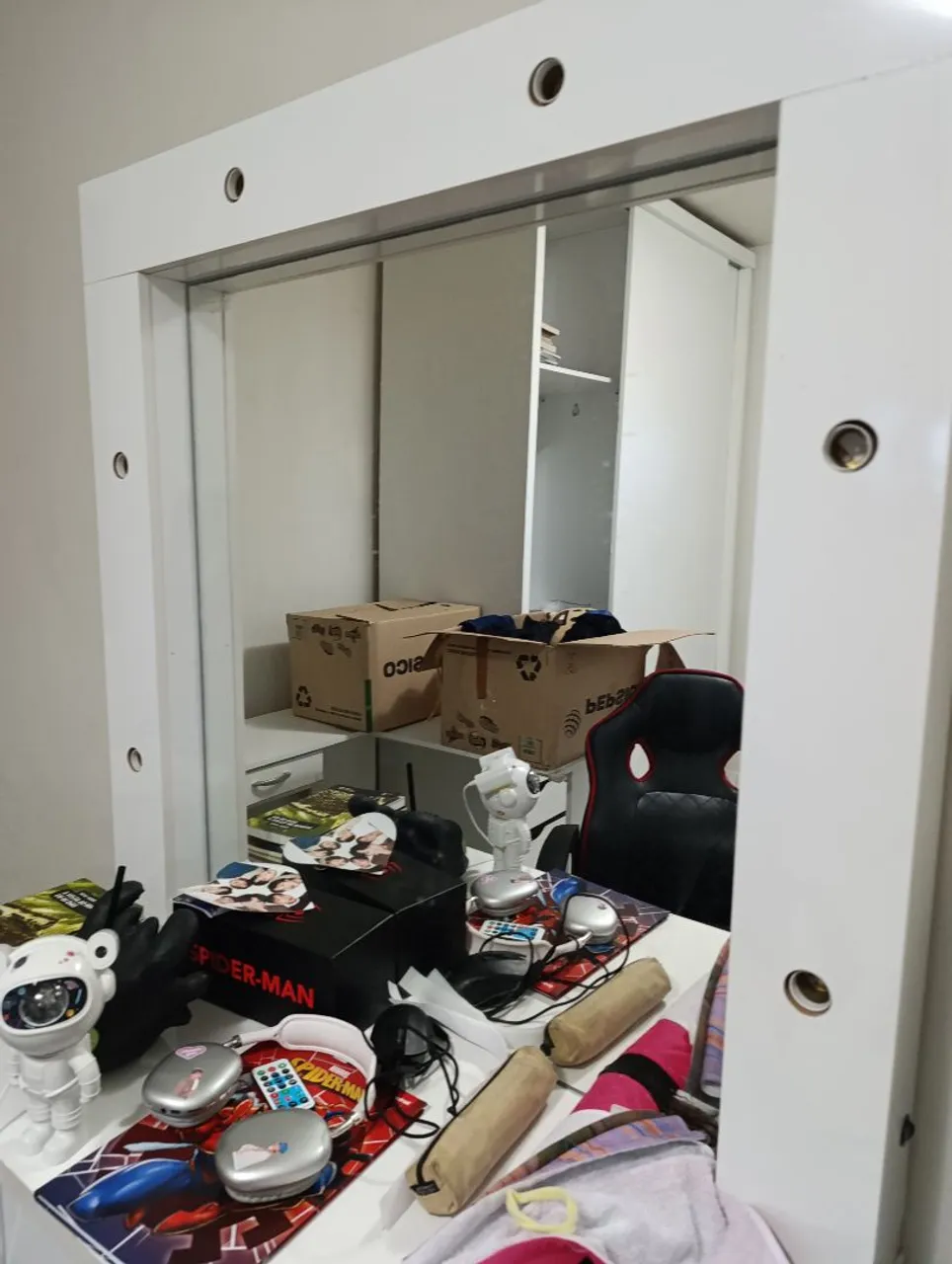 Linda penteadeira com espelho, perfeita para quem busca praticidade e elegância. Design moderno e funcional, ideal para organizar seus pertences e criar um espaço charmoso. Espelho amplo que facilita a rotina de beleza.