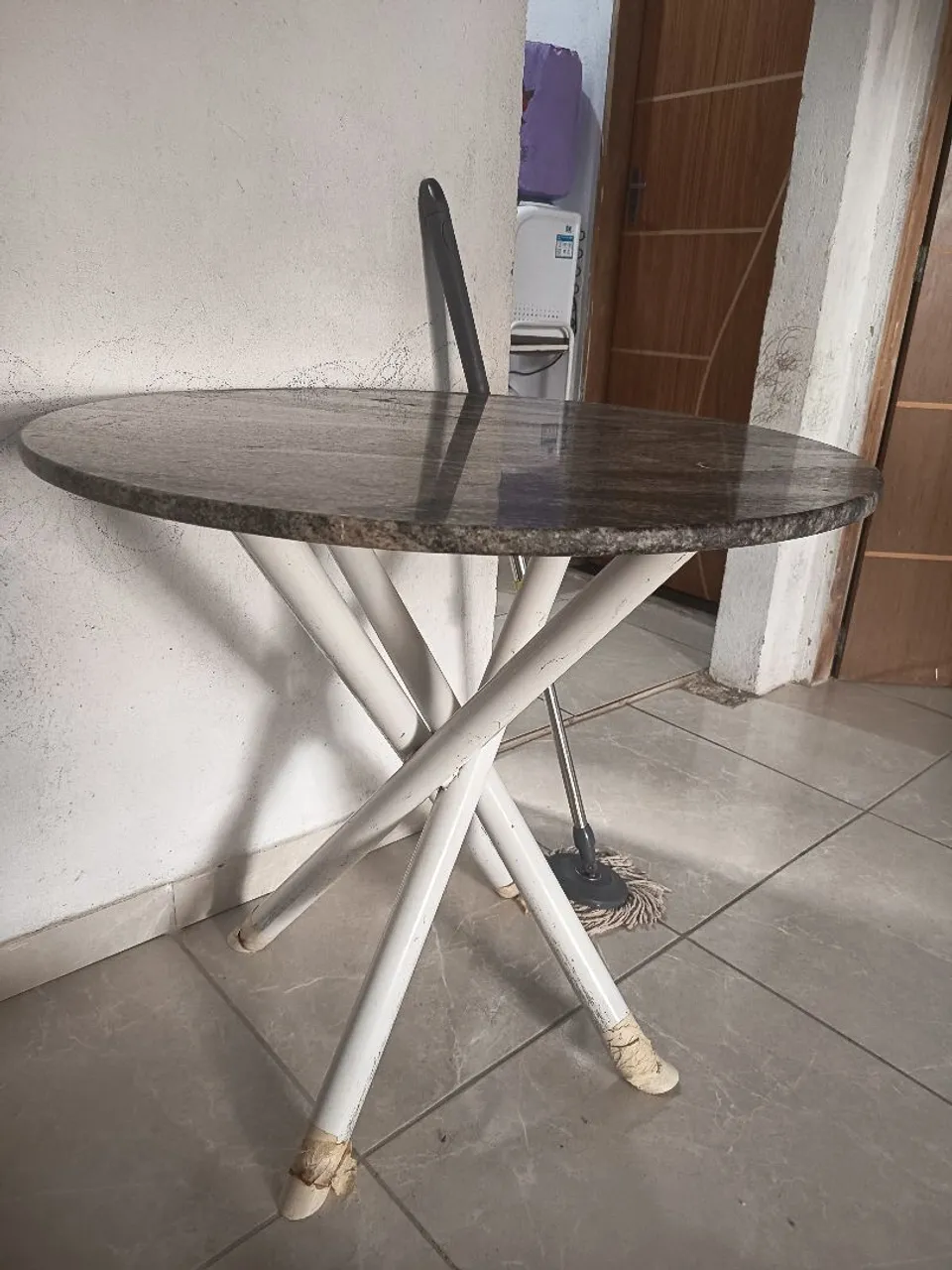 Linda mesa redonda com tampo de pedra e design moderno. Ideal para diversos ambientes, como sala de jantar, cozinha ou varanda. Perfeita para reunir a família e amigos!
