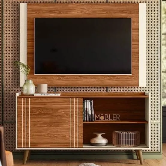 Rack com painel para TV até 50 polegadas, com design moderno e elegante. Possui porta de correr, nichos para organização, pés estilo retrô e excelente acabamento. Painel com ótimo espaço para sua TV, ideal para deixar sua sala mais sofisticada e