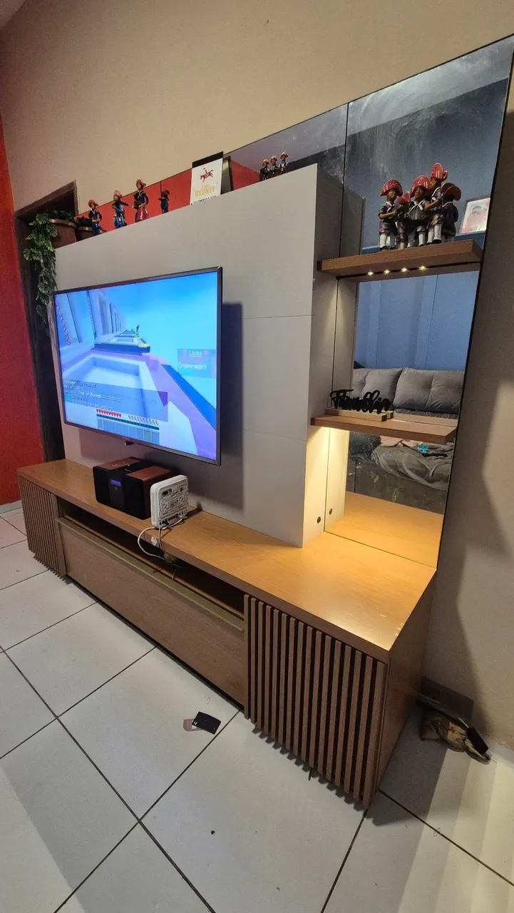Transforme sua sala com este rack elegante! Design moderno e funcional, perfeito para organizar sua TV e seus aparelhos eletrônicos. Detalhes em madeira que agregam sofisticação ao ambiente. Com espelhos e luzes. Aceito cartao de crédito e dividimos com o juros da maquineta.