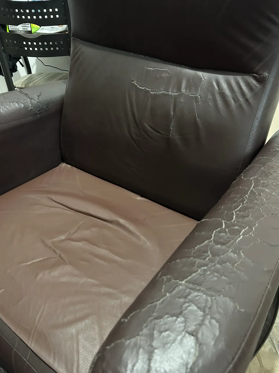 Poltrona de courino. Contém fissuras e o reclinável não funciona.