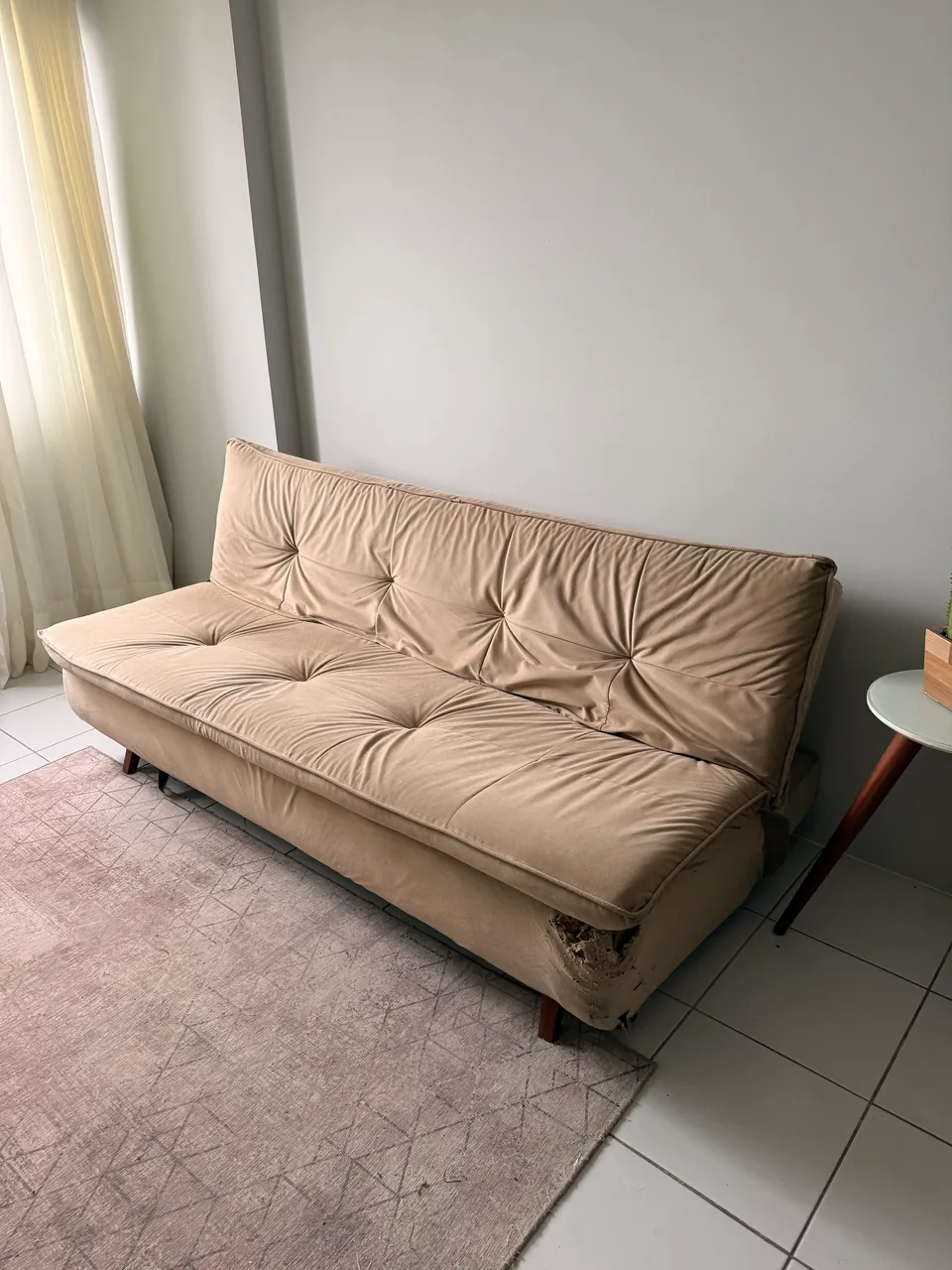 Sofá-cama de 3 lugares no tecido suede. Está com danos de uso, visíveis nas fotos do anúncio.