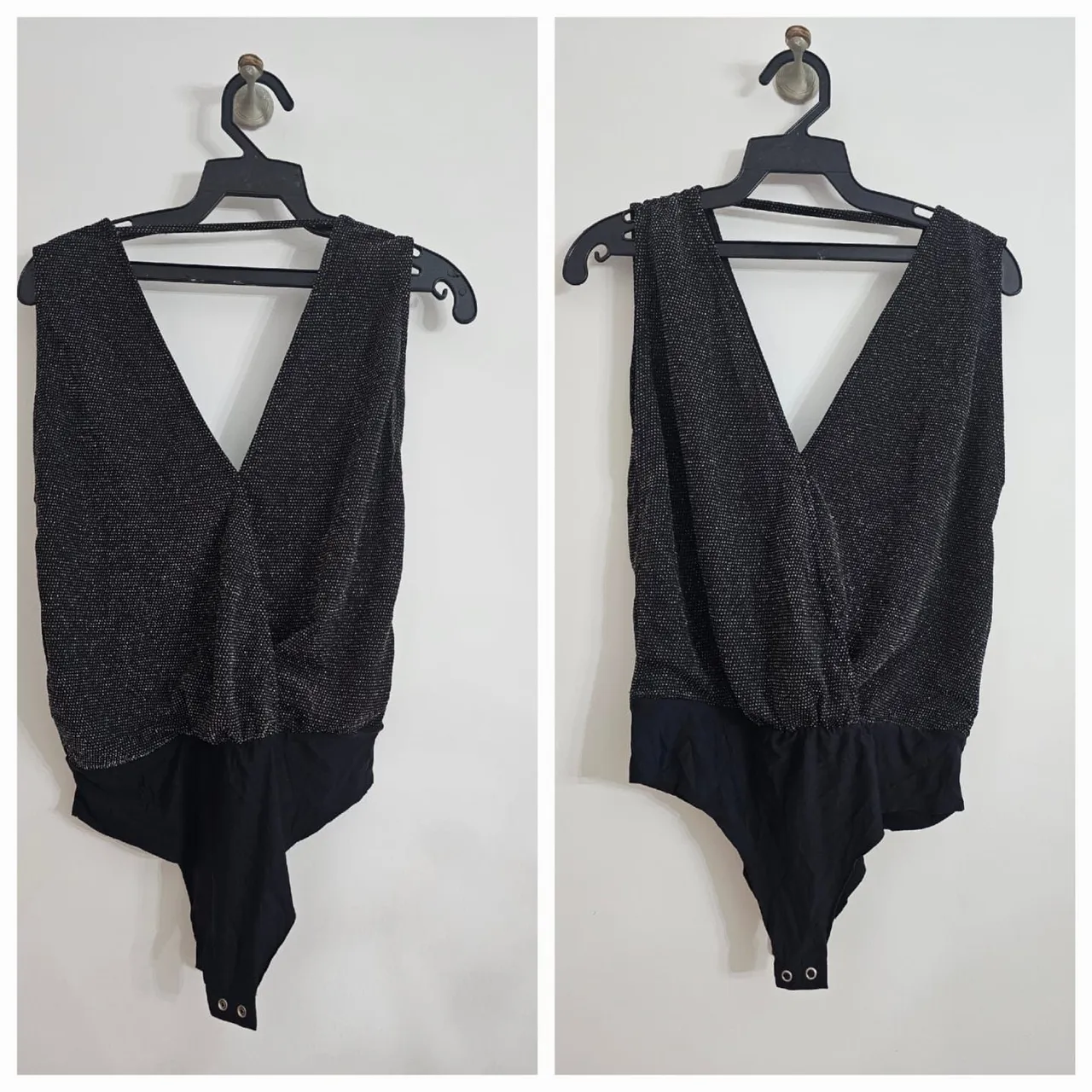 Body feminino com detalhes brilhantes prata, perfeito para um look sofisticado e moderno. Ideal para uso em festas noturnas