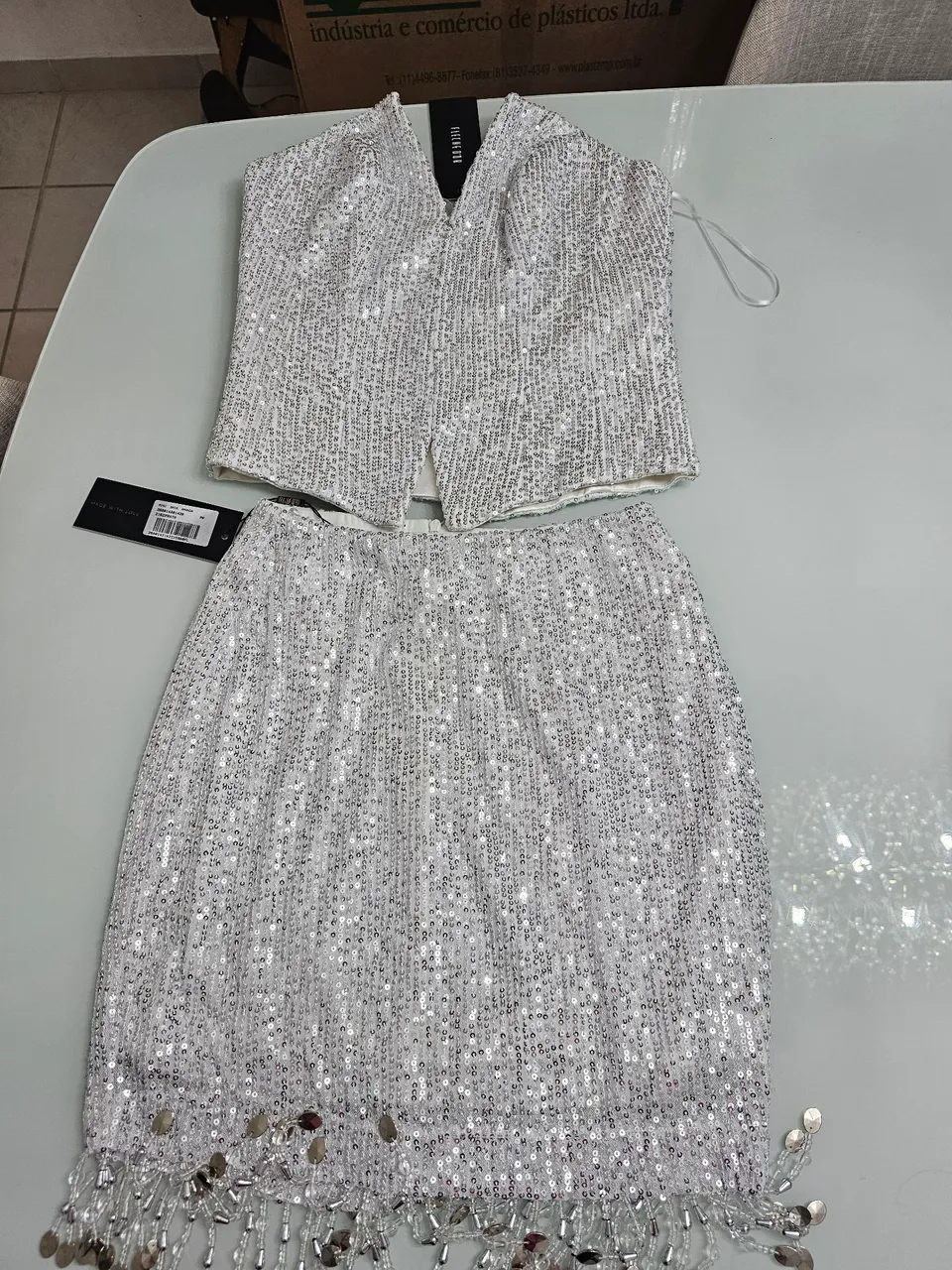 Deslumbre em qualquer evento com este conjunto de top e saia de paetês. Brilho e elegância em uma só peça!