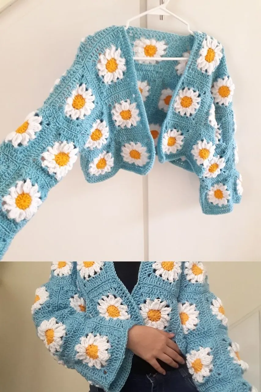 Este cardigã de crochê com flores de margarida é a peça perfeita para adicionar um toque de charme e alegria ao seu visual. Feito à mão com fios de alta qualidade, ele garante conforto e estilo em cada detalhe.