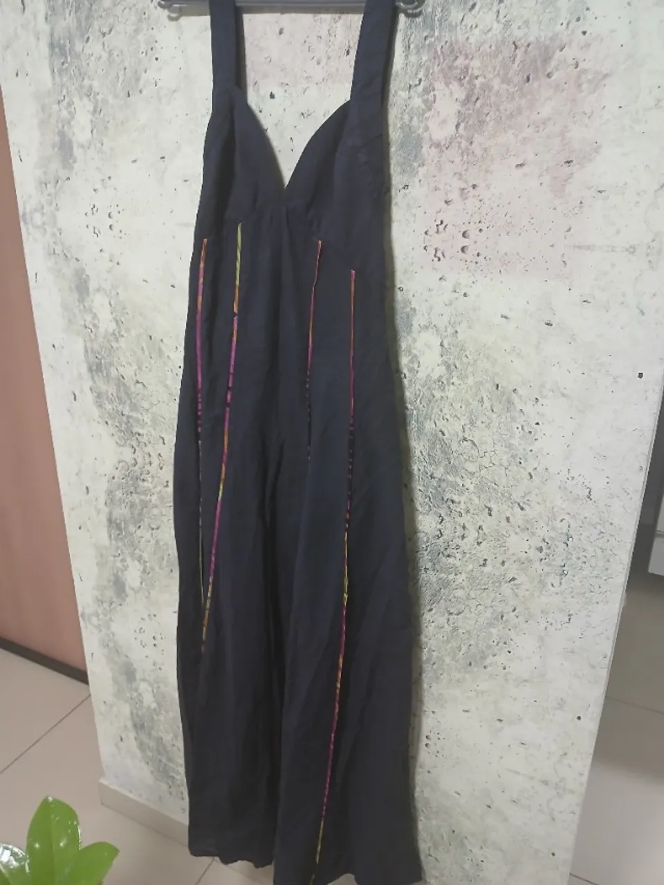 Lindo vestido longo preto com alças finas e decote em V. Detalhes coloridos nas laterais adicionam um toque especial. Perfeito para diversas ocasiões!
