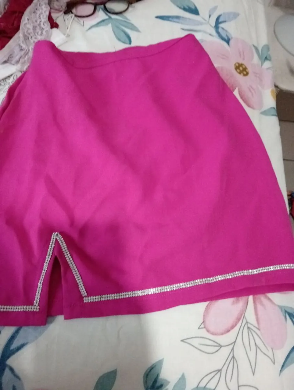 Linda saia rosa com detalhes em pedraria, perfeita para um look estiloso e cheio de charme. Ideal para diversas ocasiões, desde passeios casuais até eventos especiais.