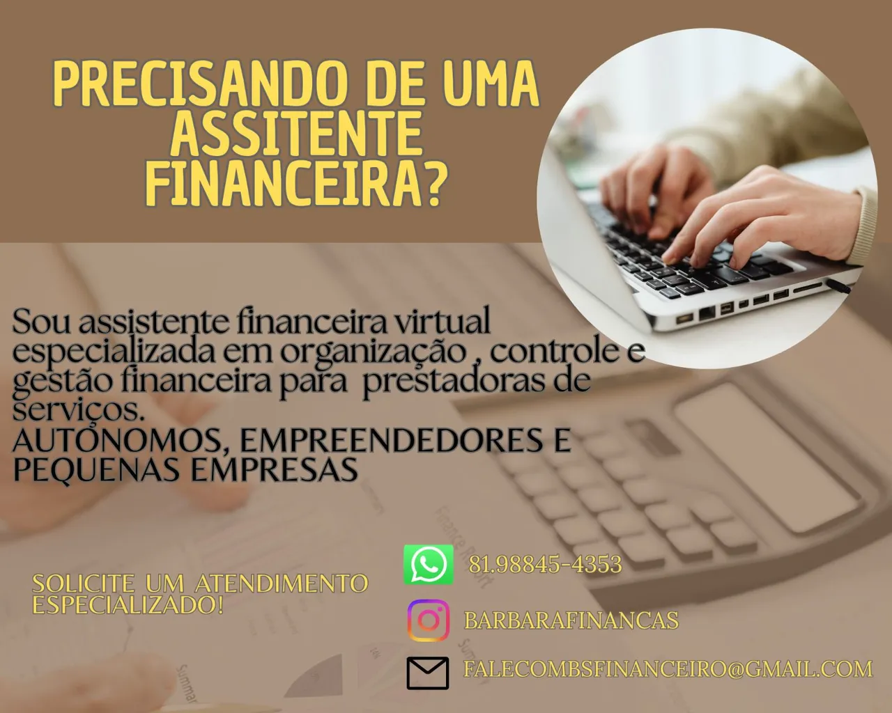 Sou Assistente Financeira Virtual especializada em organização, controle e gestão financeira para pequenas e médias empresas, empreendedores e profissionais autônomos.