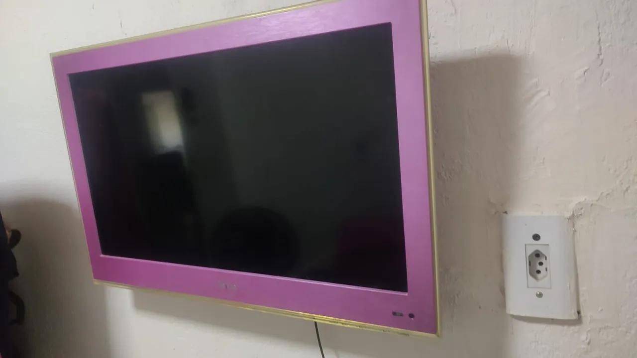 TV com design diferenciado, moldura em rosa e detalhes dourados. Perfeita para adicionar um toque de estilo ao seu ambiente! 180 reais