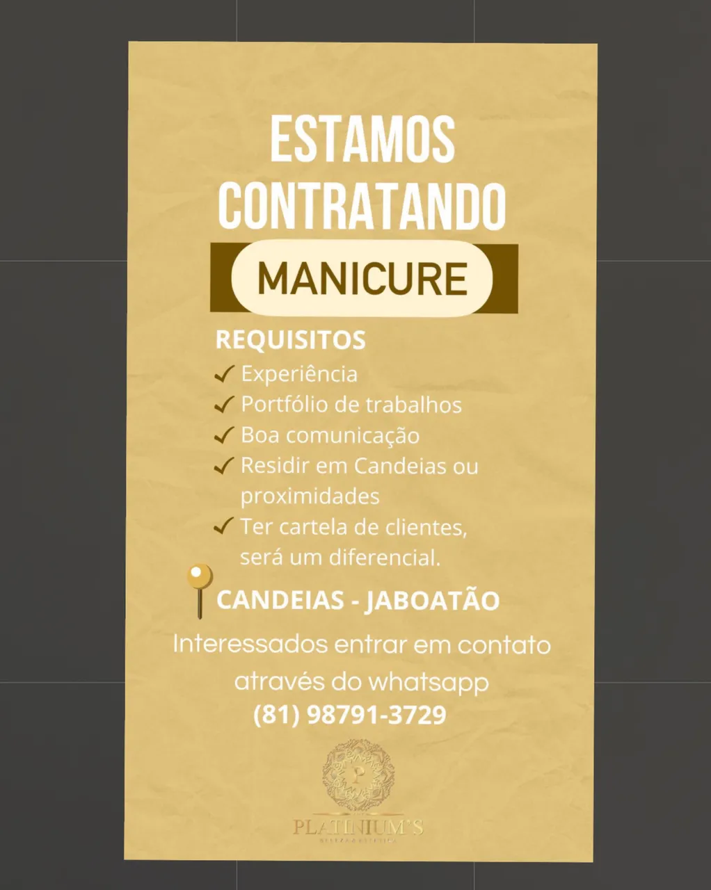 Estamos contratando cabelereiro e manicure Cabelereiro/ Maquiador será um diferencial . O salão fica localizado em Candeias na Av Bernardo Vieira de Melo . Interessados entrar em contato pelo Wattzap